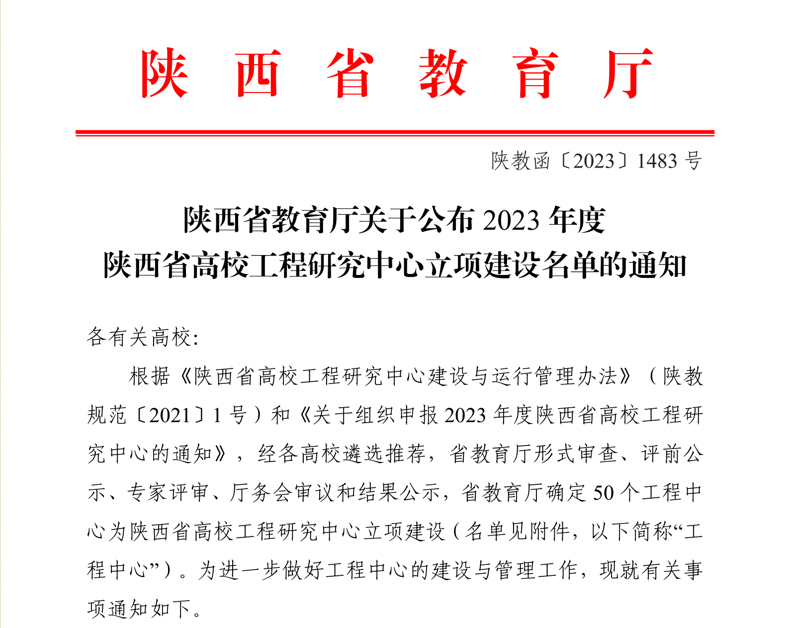近日,根据《陕西省教育厅关于公布2023年度陕西省高校工程研究中心立项建设名单的通知》(陕教函【2023】1483号)文件,我校化工与纺织服装学院依托校级重点研发平台应用化工技术研发中心申报的富硒农产品废弃物资源化利用工程研究中心获批陕西省高校工程研究中心,该中心由我校牵头,联合陕西生益科技有限公司和陕西元萃生物科技有限公司共同建设,化工与纺织服装学院刘迪教授担任研究中心主任。