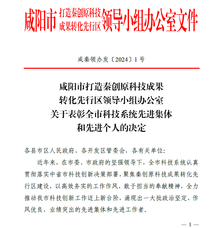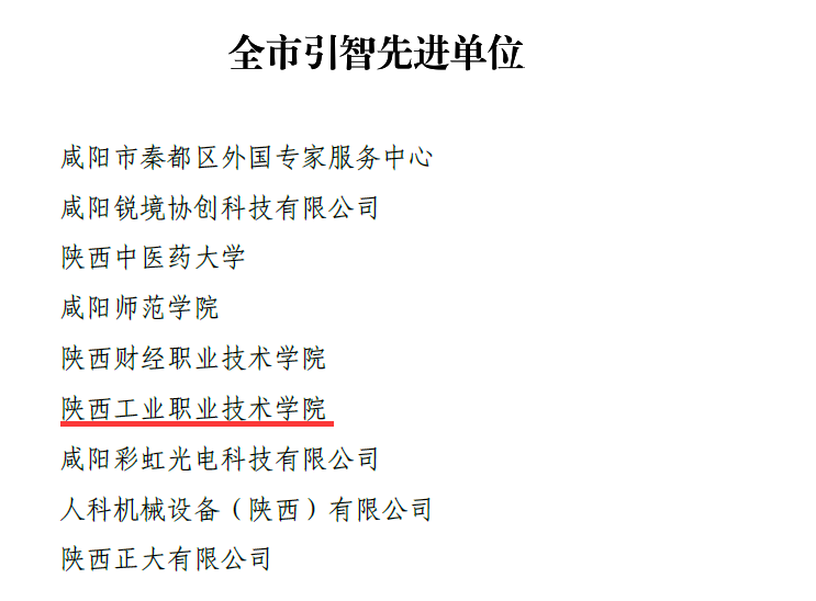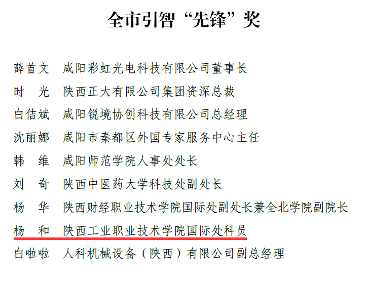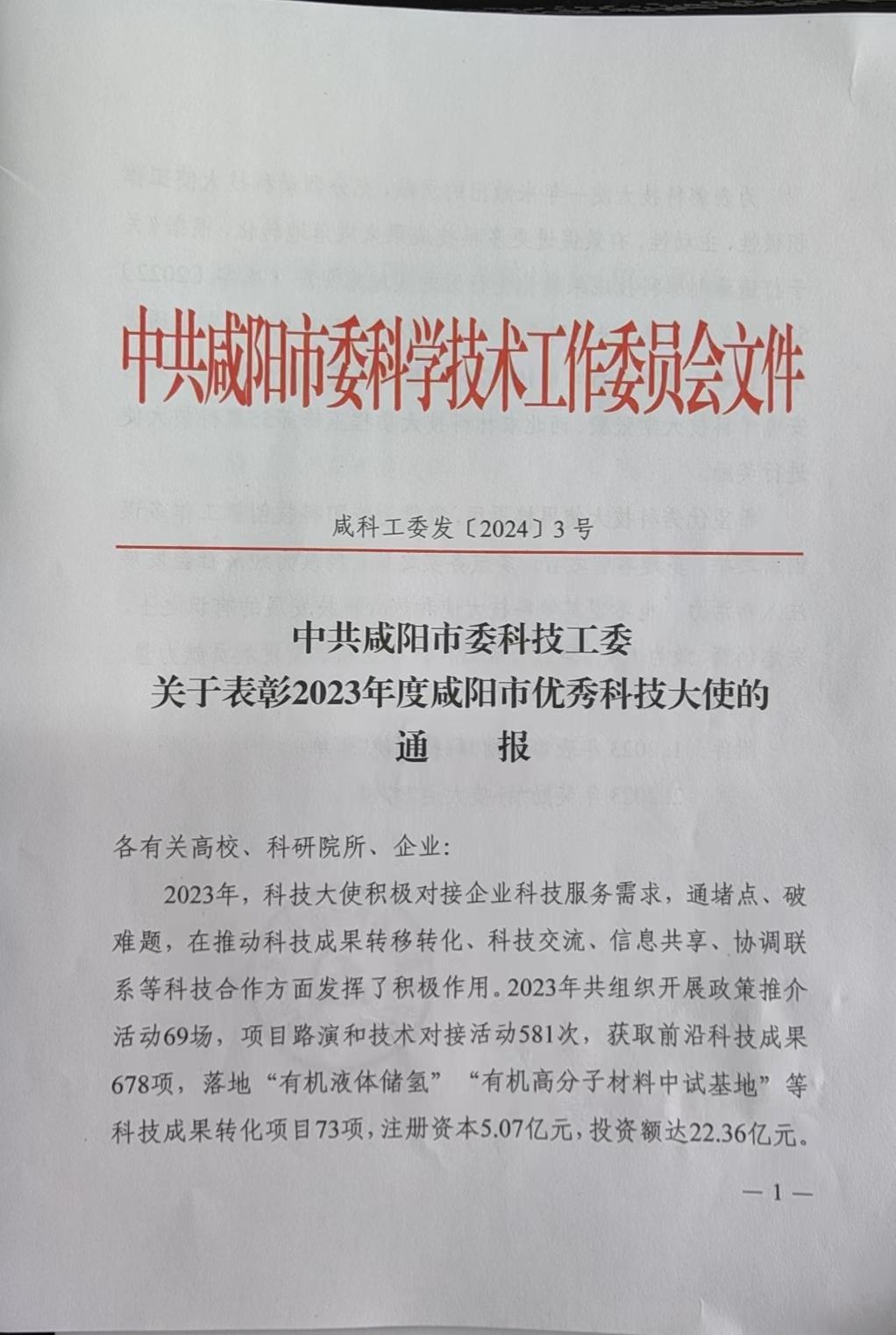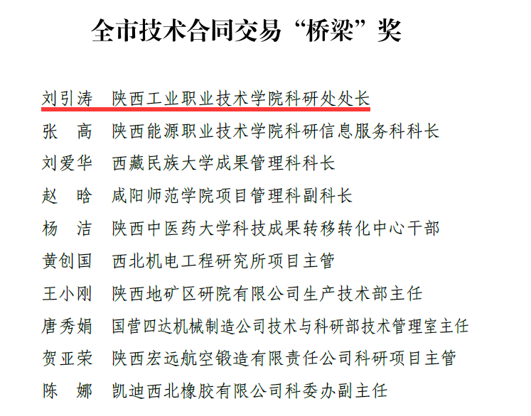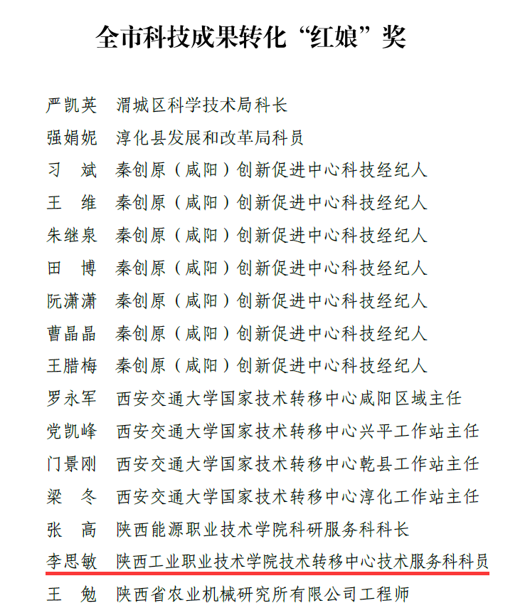 近日,根据《咸阳市打造秦创原科技成果转化先行区领导小组办公室关于表彰全市科技系统先进集体和先进个人的决定》(咸秦领办发【2024】1号)《中共咸阳市委科技工委关于表彰2023年度咸阳市优秀科技大使的通报》(咸科工委发【2024】3号)文件精神,我校获得咸阳市多项表彰,其中学校荣获2023年度咸阳市引智先进单位,科研处处长刘引涛获咸阳市技术合同交易“桥梁”奖和优秀科技大使荣誉称号、西部创新创业研究院院长胡平获优秀科技大使荣誉称号,科研处技术服务科李思敏获咸阳市技术合同交易“红娘”奖、国际交流处杨和获咸阳市引智“先锋”奖。