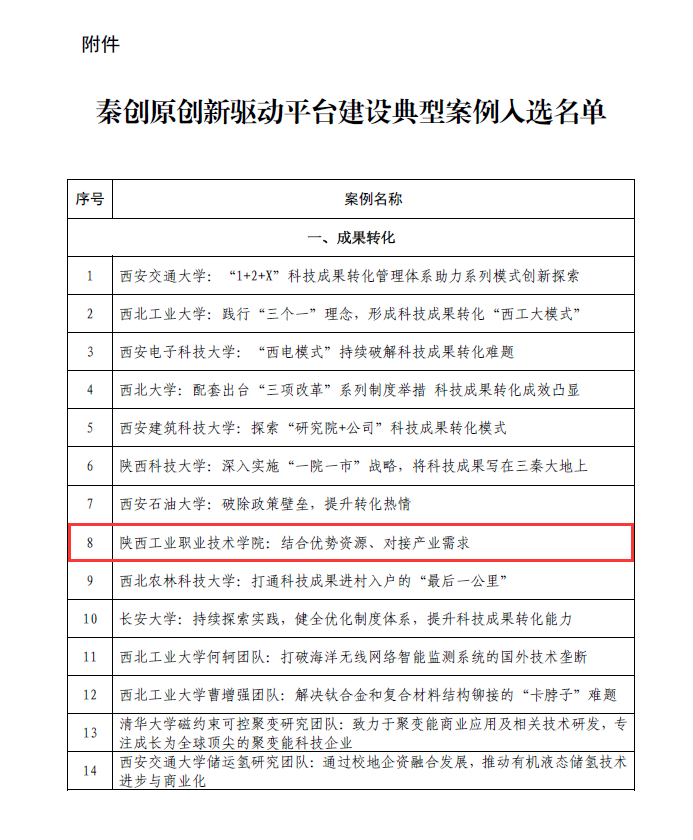 4月3日,省科技厅发布通知,为充分发挥典型案例示范带动作用,推动秦创原建设提质升级、由势转能,加快培育发展新质生产力,陕西省秦创原创新驱动平台建设工作领导小组办公室公布《秦创原创新驱动平台建设典型案例》,我校“结合优势资源、对接产业需求”案例成功入选,我校是全省唯一一所入选案例的高职院校。