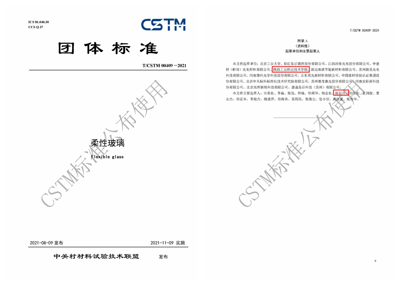 近日,经中国材料与试验团体标准委员会建筑材料领域委员会提出,特种玻璃技术委员会(CSTM FC03/TC15)归口的《柔性玻璃》标准(编号T/CSTM 00409—2021),由中关村材料试验技术联盟发布实施。北京工业大学牵头制定该标准,我校为主要起草单位,材料工程学院侯延升博士为主要起草人。