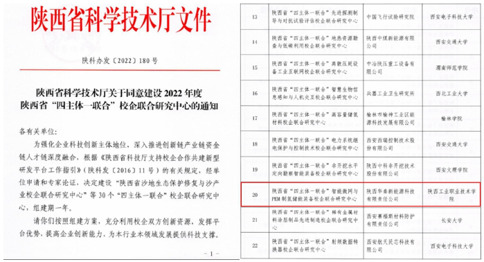 近日,陕西省科学技术厅发布了《陕西省科学技术厅关于同意建设2022年度陕西省“四主体一联合”校企联合研究中心的通知》(陕科办发[2022]180号),由我校与陕西华秦新能源科技有限责任公司联合共建的“智能微网与PEM制氢储能装备校企联合研究中心”获批建设陕西省“四主体一联合”校企联合研究中心,全省共获批30个研究中心,我校也是唯一获此平台的高职院校。