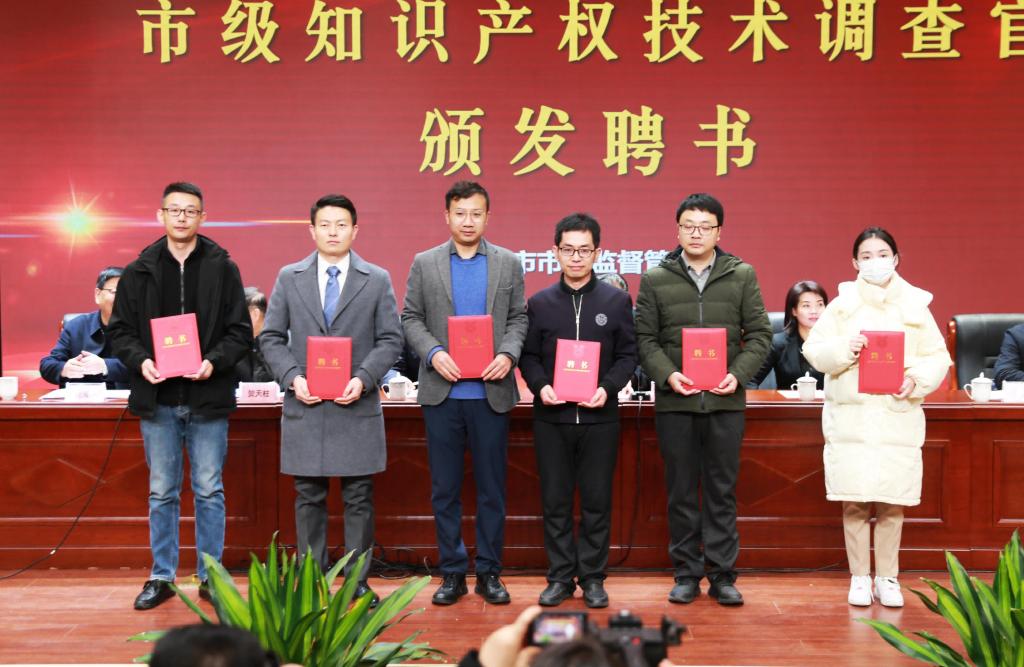 接着,主持人宣读市级知识产权技术调查官认定文件,参会领导为刘引涛等16位同志颁发咸阳市第一批知识产权技术调查官聘任证书。在全体参会人的见证下,我校党委副书记贺天柱、市市场监管局二级调研员张文军共同为咸阳市知识产权保护服务联盟揭牌。